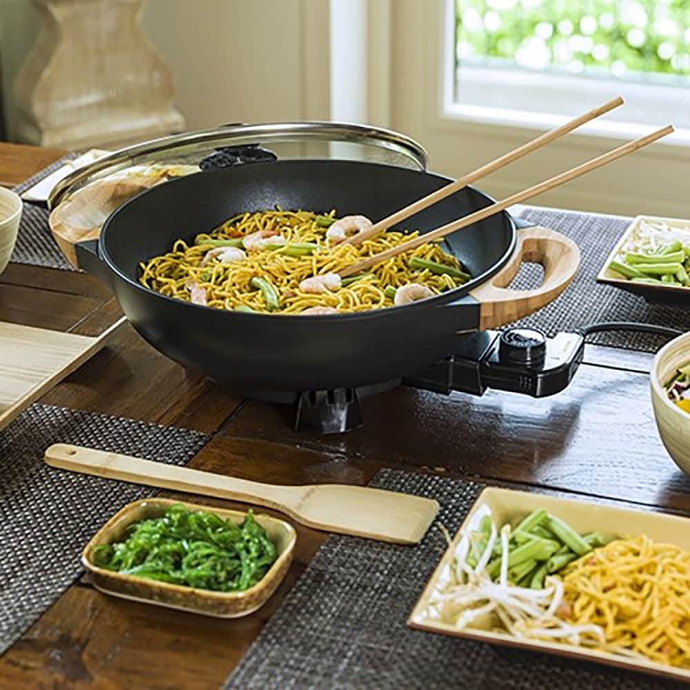 Le wok est un ustensile de cuisines très pratique, car un appareil wok électrique est un ustensile multifonction. En effet, un wok électrique peut être utilisé pour plusieurs types de cuissons, à savoir pour faire sauter des aliments. C’est tout naturel, car nous le savons tous, le wok est l’appareil idéal pour faire chauffer un peu d’huile et y laisser mijoter vos légumes dedans pour un résultat à la fois appétissant et croquant. Et grâce à son couvercle, qui est soit vendu avec le wok soit vendu à part, on peut cuire les aliments à l’étouffée.