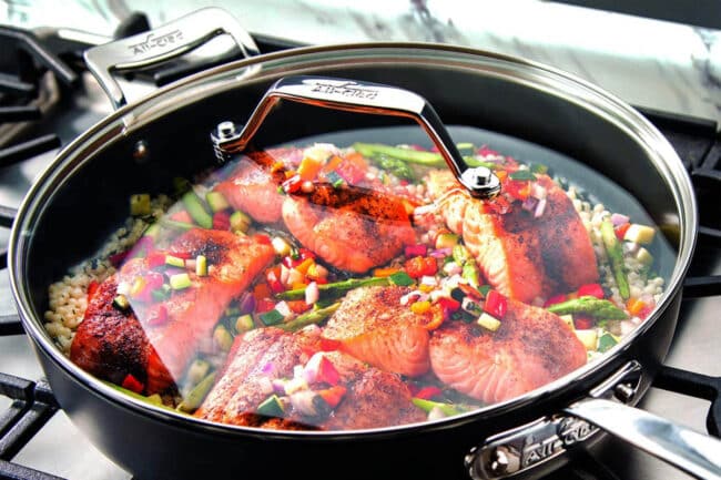 Notre sélection : Le set All-Clad Essentials, 10 pièces antiadhésives (disponible sur Amazon), illustre le savoir-faire de la marque : épais aluminium anodisé, triple revêtement, nettoyage simplifié.