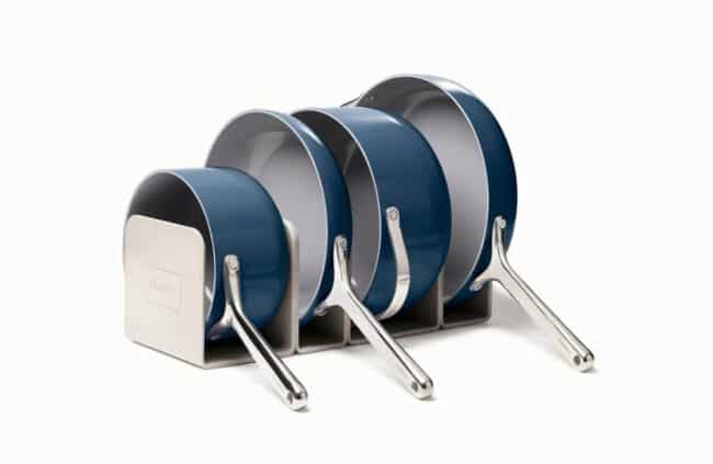 Notre sélection : Le set Caraway (disponible chez Caraway) propose poêle, sauteuse, casserole et faitout, avec trois couvercles, dans un éventail de huit couleurs.