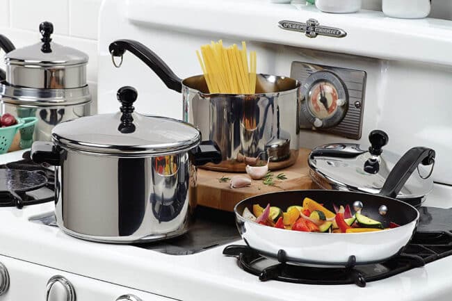 Notre sélection : Le set Classic Stainless Steel (disponible sur Amazon) propose sept casseroles et poêles, cinq couvercles et trois ustensiles adaptés.