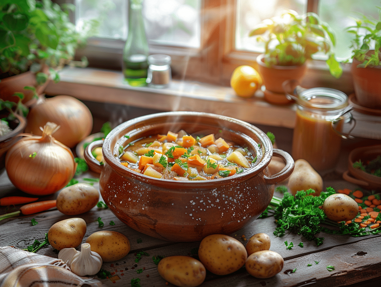 Au registre des aromates, le thym, le laurier et les baies de genièvre jouent un rôle clé. Ils insufflent au Baeckeoffe des notes parfumées et subtiles, renforçant la complexité aromatique du plat. Ces saveurs, entrelacées au sein de la terrine, se marient à la perfection avec la marinade, traditionnellement à base de vin blanc d’Alsace, qui imprègne les ingrédients de ses arômes fruités et sa légère acidité.
